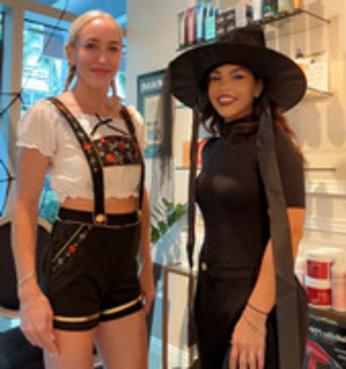 :Laura & friend in costume at the hair salon.