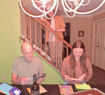 Opening cards and gifts. Jaden overseeing from the stairway,